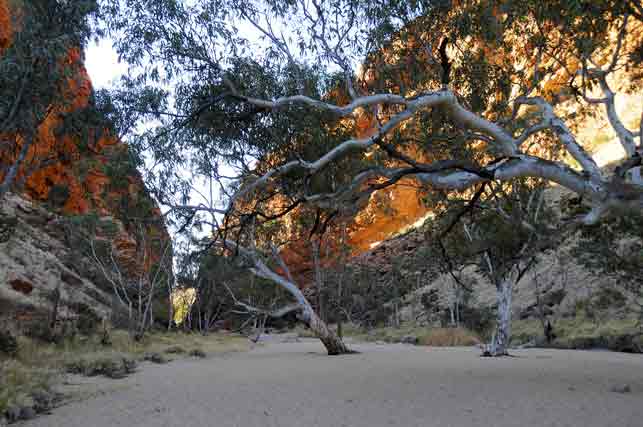 An easy and intriguing side road (track), of some five kilometres, brings one to the car park for this walk. One descends down to a track that follows the river bed. A rocky path interspersed with sandy portions leads one closer to the gorge. Stunning red cliffs and ghost gums bring to life an Albert Namajeri canvas as ones eyes see what this great artist once saw.