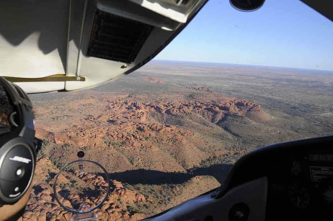 Our aircraft was soon skimming over the top of the rock escarpment known as Kings Canyon, then tight turning back around to afford us stunning visuals of this popular natural wonder. We could see the small figures of hikers and the unusual rock shapes so common to deserts, not only in Australia but, around the world were evident. Our pilot now headed into a wide low desert valley and we flew up the centre with the canyon “escarpment” walls on either side. After some time zig zagging we departed this region with a course set for the Olgas, climbing to 7000 feet to afford a more extensive birds eye view of the country around us. The distant shapes of Uluru and the Olgas were easy to note due to their large mass thrust up out of an otherwise flat landscape.