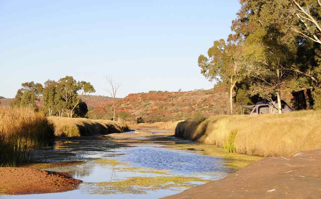 The camp ground is stunningly sited facing across the river to a small escarpment. Birdlife abounds and is satisfying to ardent birdwatchers as was evidenced by two parties of campers there at the same time as us. Evening and dawn colours are a photographers dream palate and children will find an outdoor play area of exceptional beauty. Facilities are well above what one who is used to bush camping requires. Solar power heats the water for showers and hand basins. There are also public use gas rings and hot plates. Large metal receptacles are for communal fires, thus ensuring not only safety, but more minimal use of wood.