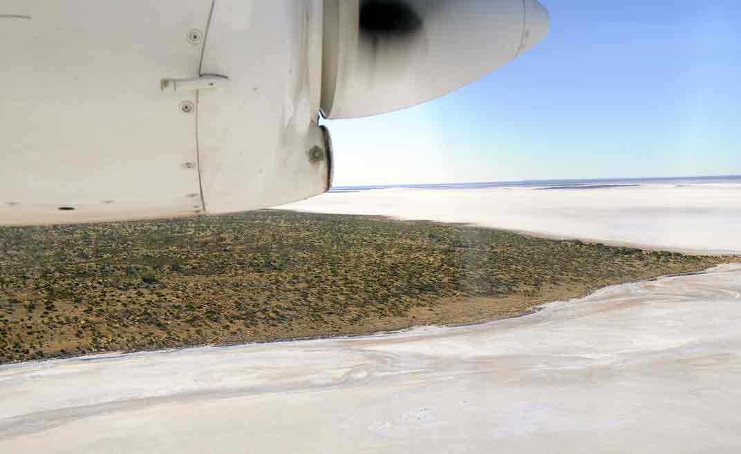 After take-off we headed northeast towards Lake Amadeus. The white mass of a salt lake soon became evident and the pilot descended to 500 feet for the ‘fly over and fly around’. This is a great height to observe things as we wove and circled, up down and around this massive salt lake. The contrast in colours between the desert ‘shore’ and white of the salt was absorbing to my eye.