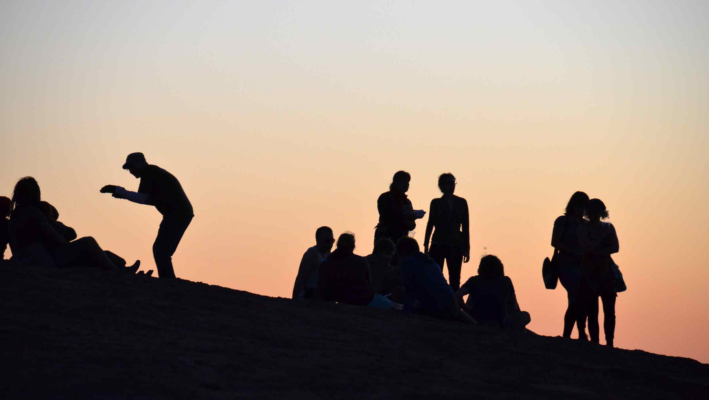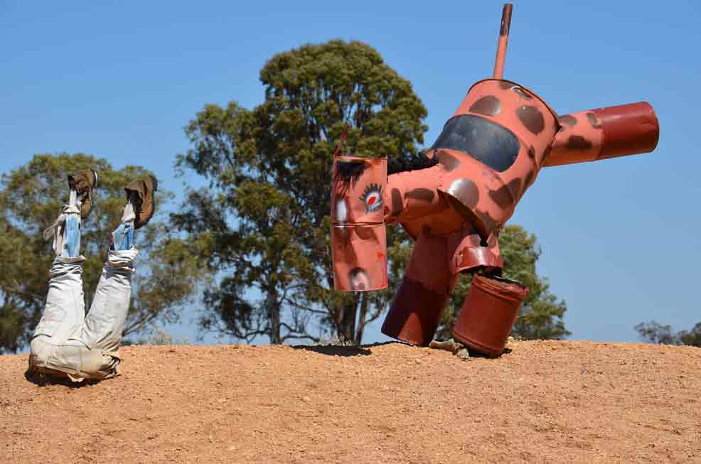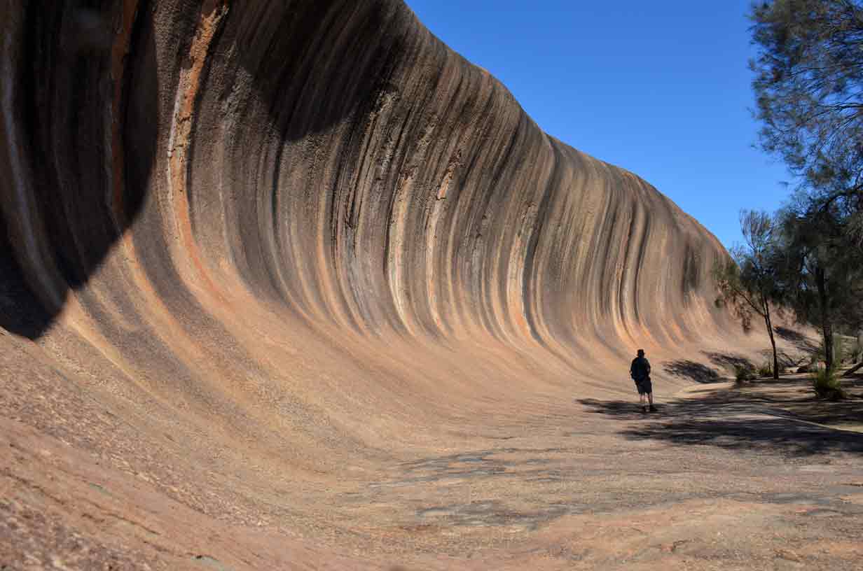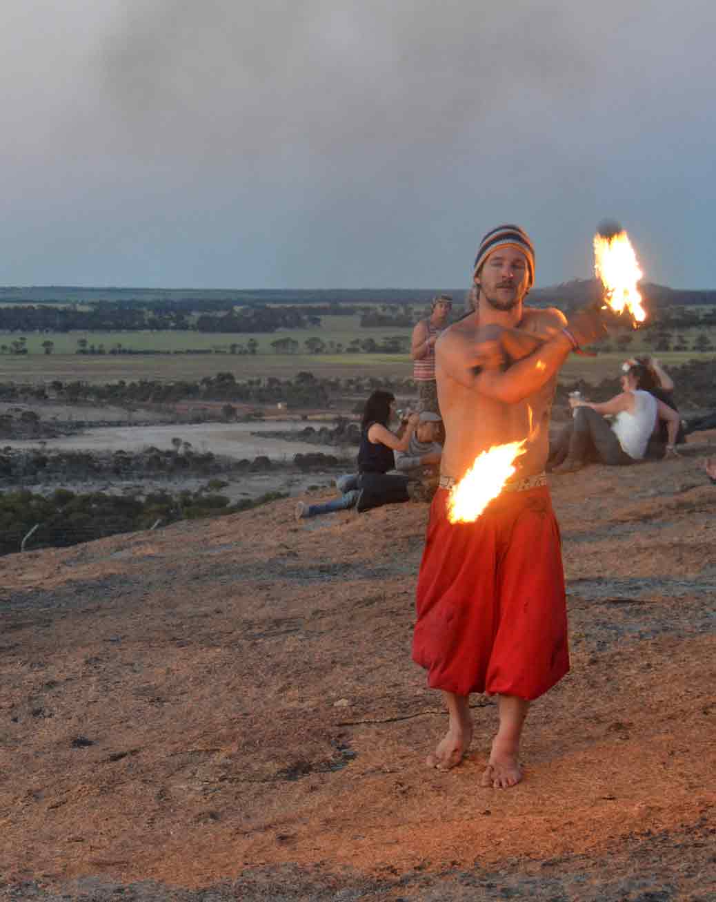 We were racing the clock to reach wave rock n order to climb and witness the sunset. On entering Hayton I dutifully slowed to the requisite 50km per hour. And there standing behind a tree in the centre of the town was the local policeman with a hand held speed gun. This was the first time I had seen a policeman in W.A. My wife said, ‘aha to catch the tourist rushing for the sunset’. Hmm said I. We eventually reached the approach road to the rock and were immediately struck by the number of cars parked along the verge of the approach road. Good grief, that many people are here for the sunset! Car after car greeted us, where to park we thought and then a long walk to the rock! However, as we got closer (no reduction in car numbers), we heard pounding rock music and saw that the campsite had been transformed to a ‘festival’! Entry to the ‘tourist’ car park was without hassle and we were soon scrambling up the sides of the rock with throngs of festival patrons The crest of the rock brought a scene of ‘fire swingers’, the waft of ‘reefers’ and aptly dressed ‘trendy’ types.