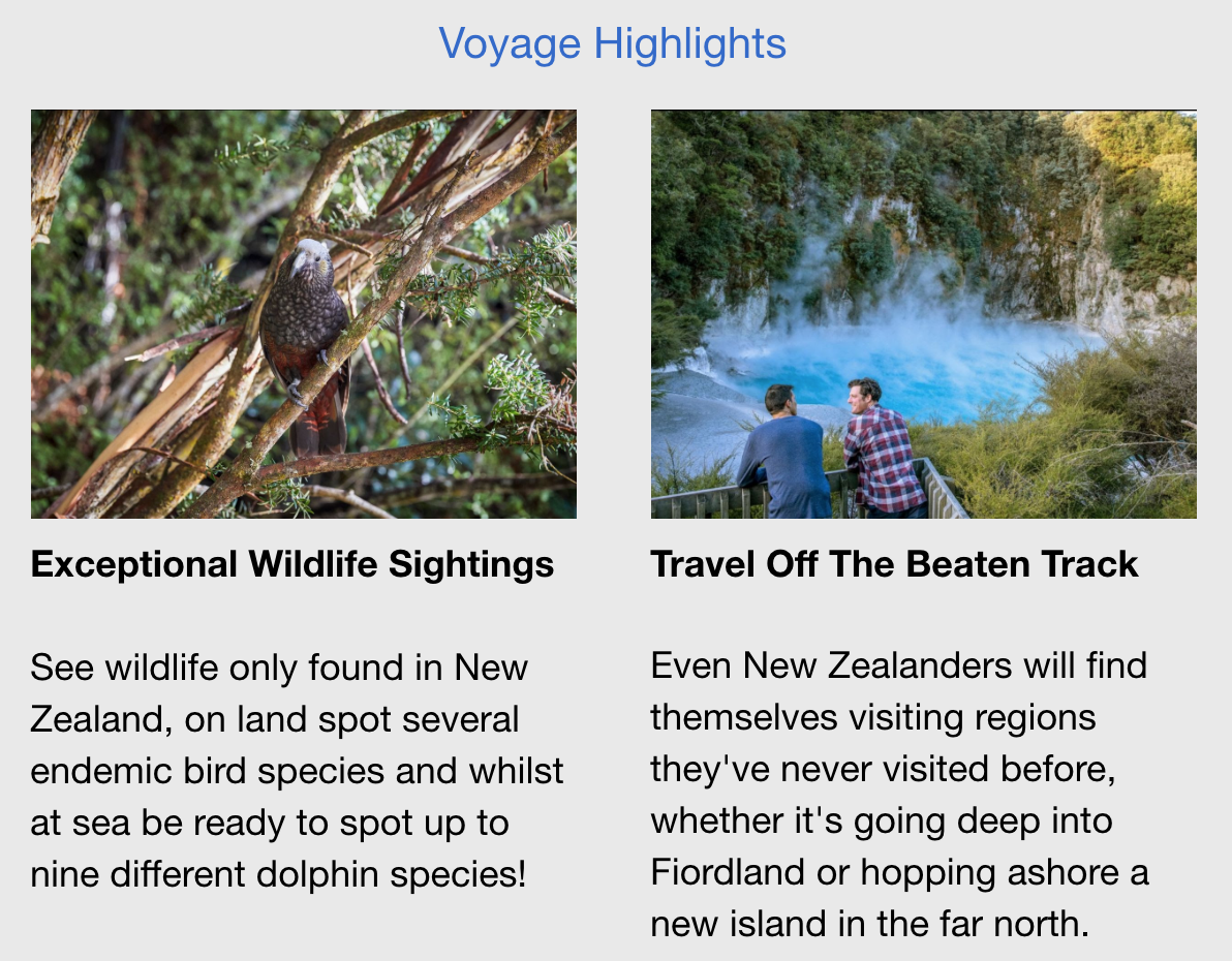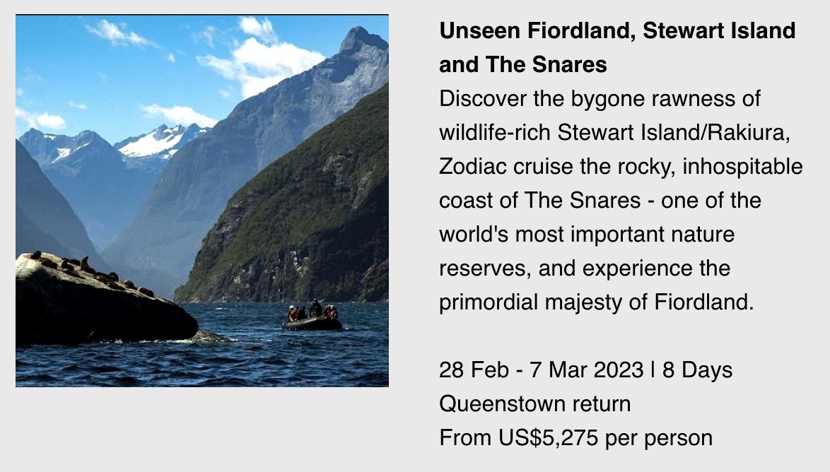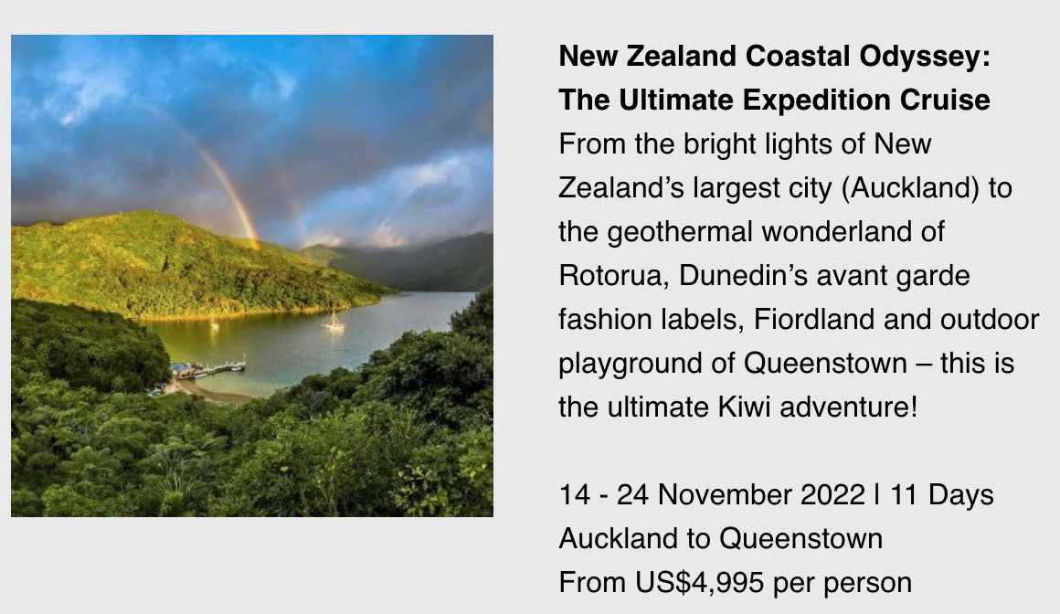 This ship is not a ‘mega cruise boat’. These cruise on board Heritage Adventurer fall into the category of expedition cruises. They get into more remote places and concentrate on nature and wild NZ.